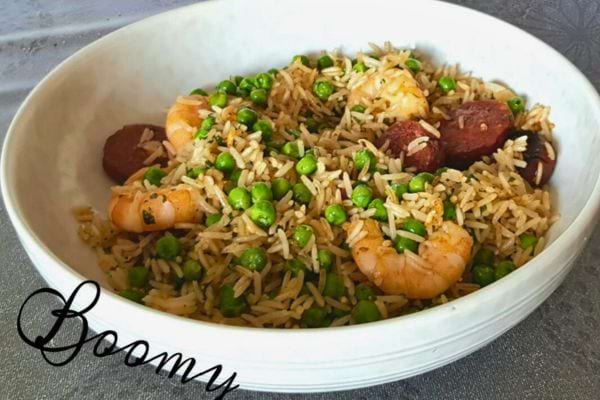 - 14. Riz frit aux crevettes chorizo petits pois et coriandre