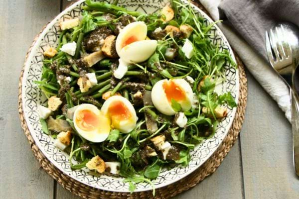 6. Dans un saladier, mélangez les haricots verts, les artichauts, la roquette et les croûtons.