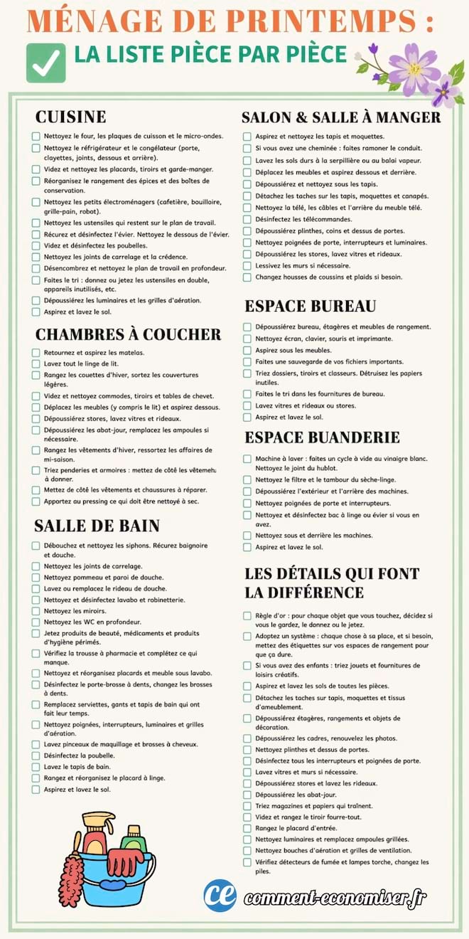Cette check-list reprend chaque pièce de la maison, du sol au plafond, pour que rien ne vous échappe.