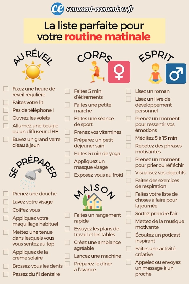 💡 Inspirez-vous des 44 idées sur la liste pour bien structurer vos matinées et commencer la journée du bon pied !